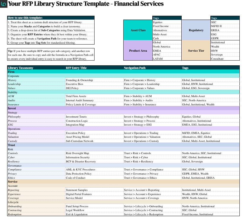 This template walks you through structuring your request for proposal library, from defining your core framework to organizing content in a way your team can actually use.